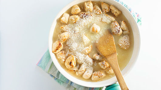 If you end up with leftovers of this garlic chicken and rice dinner, store in the refrigerator, tightly sealed. When reheating, stir in 1 to 2 tablespoons of broth, milk or cream to bring back the creaminess.