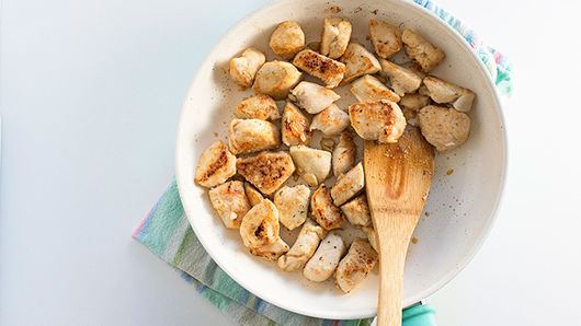 Toss the chicken breast with garlic powder, salt, and pepper. Heat olive oil in a 10-inch skillet over medium heat. Add chicken breast and cook until browned, stirring often, about 3 minutes. Add garlic to skillet and cook for 30 seconds more.
