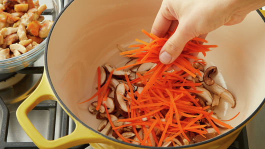 In 5-quart Dutch oven, heat vegetable oil over medium-high heat until hot but not smoking. Add chicken in an even layer. Cook 5 to 6 minutes, without moving, until browned. Stir chicken; cook 2 to 3 minutes longer or until no longer pink in center. Using slotted spoon, transfer chicken to small bowl, and cover with foil. Add mushrooms and carrots; cook over medium-high heat 7 to 9 minutes, stirring occasionally, until softened.